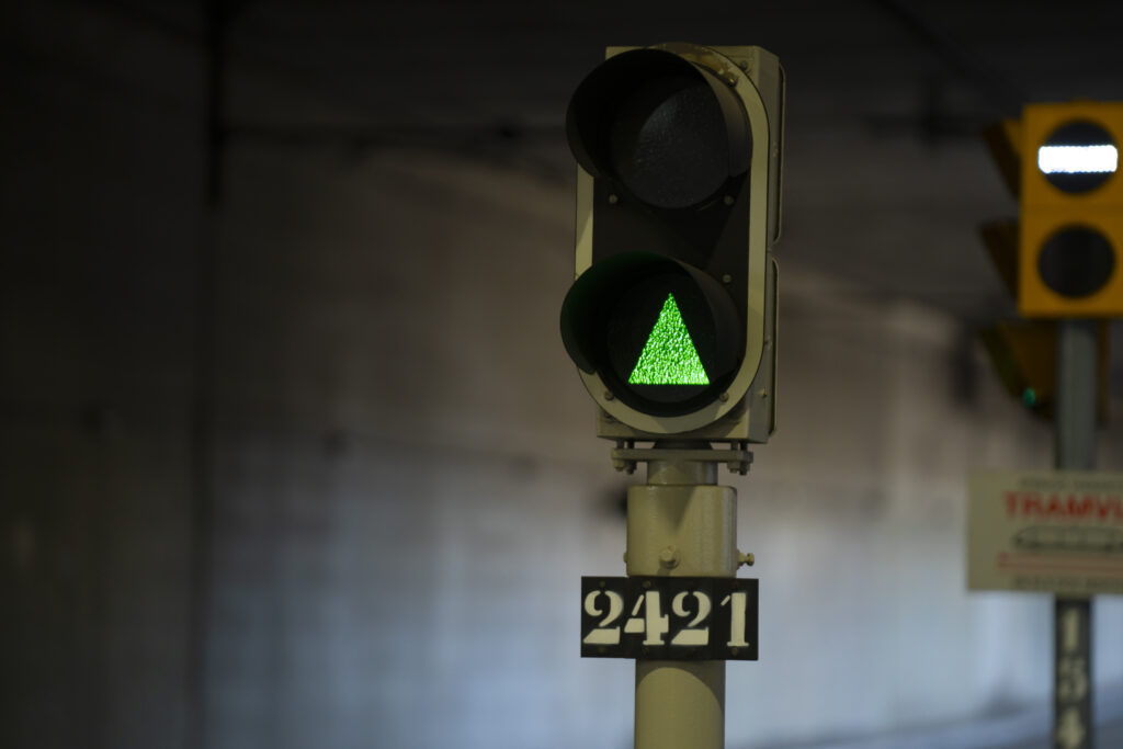 Aquest semàfor és únic. Només n’hi ha un, al túnel de la Gran Via i indica al personal de conducció si la parada següent està ocupada per un altre tramvia o està lliure. En vermell, hi ha un tramvia a la parada següent i cal esperar. En verd, la parada està buida i el tramvia pot continuar.